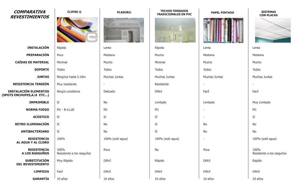 Presentamos a continuación una tabla comparativa donde podrá informarse de las diferencias del CLIPSO ® comparado con otros materiales.